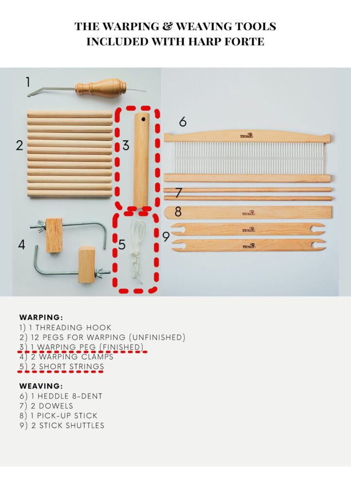 The second element that we are introducing is short strings instead the U-helper. Instead of the traditional fork U-helper made of wood, which was only able to hold the rod on one side, the strings (already used in the Presto loom) allow the rod to be firmly fixed on two sides during warp preparation, making it easier to tension the warp evenly. It is still possible to order an additional wooden u-helper, for those who prefer this option.