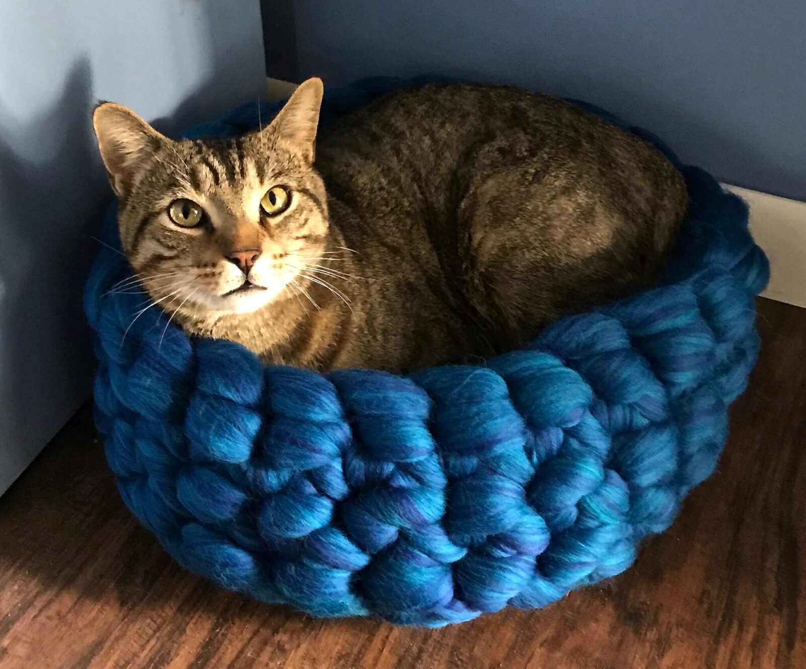 This makes a very soft and cosy bed for a cat or small dog. This project is not well suited for an overly playful pet as the roving itself is easily shredded by rambunctious claws. But if your mature cat is looking for a special place to curl up, this will certainly make him happy!