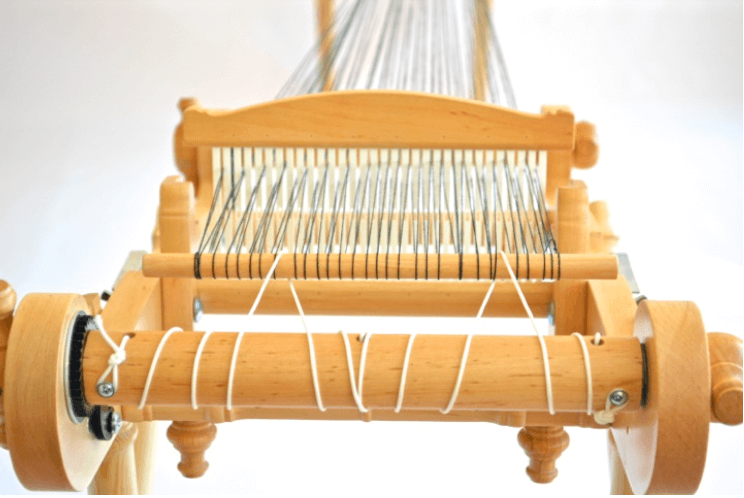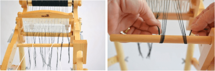 Once all of the warp threads are in place, wind the loom, using the knobs on either side of the back beam,  until there is some tension on the warp before removing the dowel from the Warp Helper.