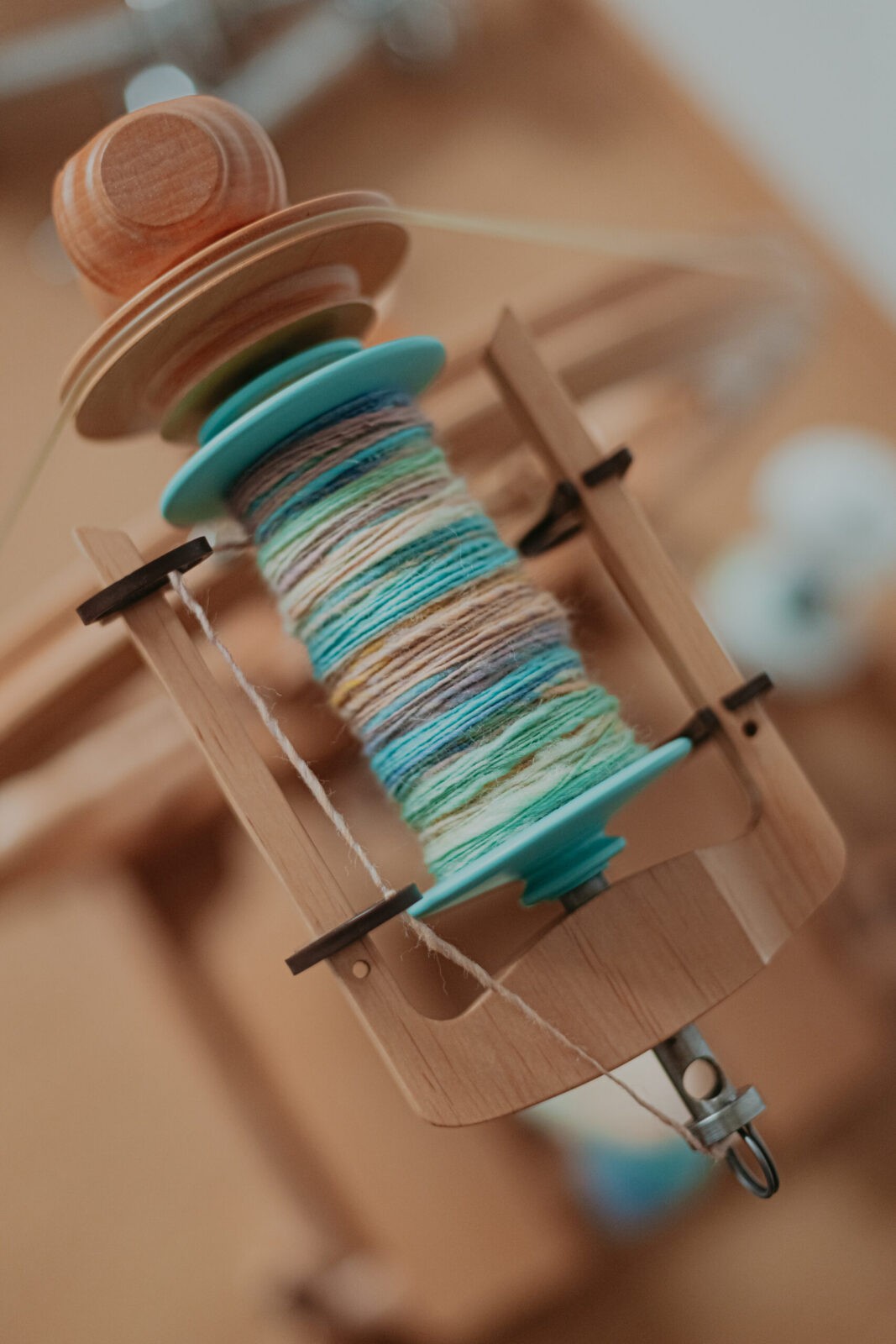 Its versatility increases even further with the optional Jumbo Flyer Kit. This upgrade expands spinning possibilities in two key ways: the larger orifice accommodates everything from lace-weight yarns to super bulky art yarns, and the jumbo bobbin doubles capacity—from just over 4 oz. to a full half-pound—allowing for longer, continuous drafting and skeins with greater yardage.