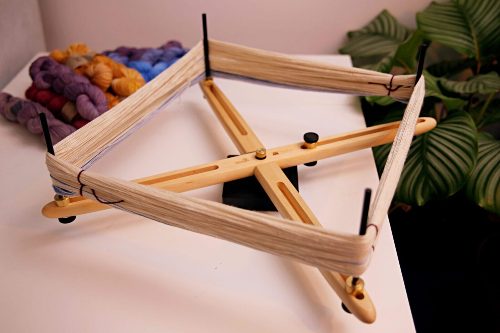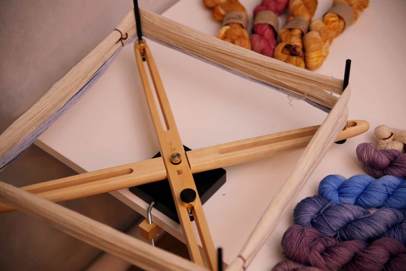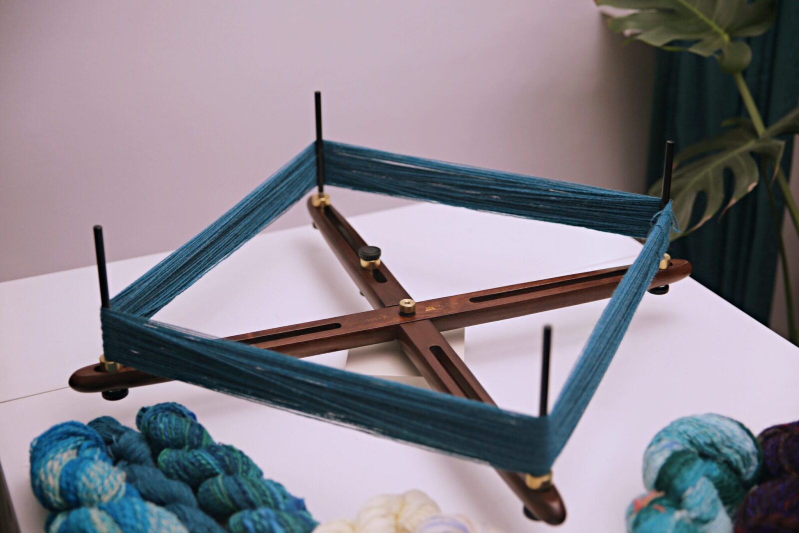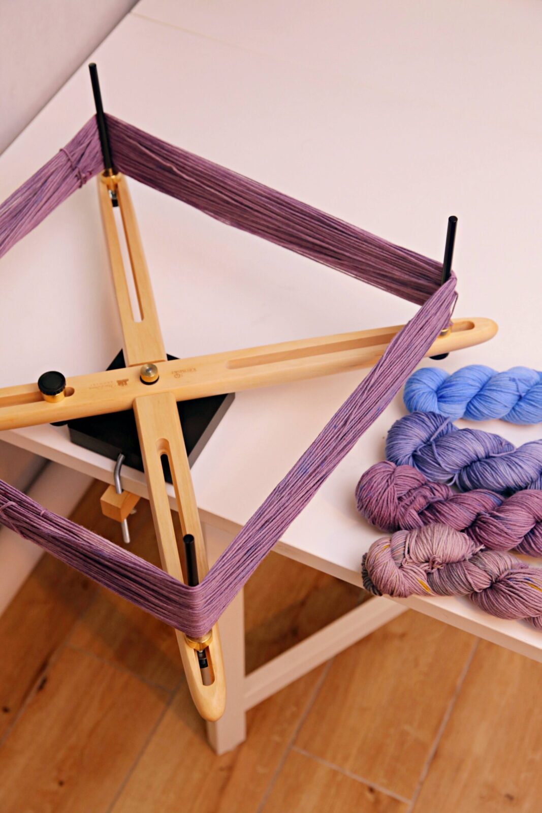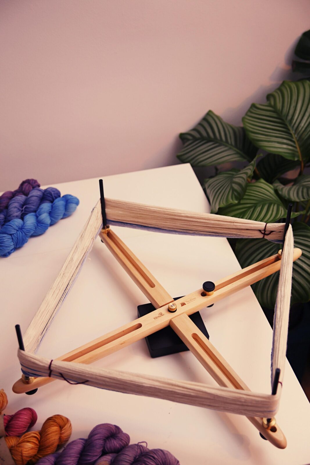Every fiber artist—whether you’re a spinner, knitter, crocheter, or weaver—can enhance their craft with a high-quality skein winder. Meet the new Vivo: thoughtfully designed for versatility and ease, it adjusts effortlessly to accommodate any skein size. Just slide the metal posts to your desired position and lock them in place with durable brass knobs.